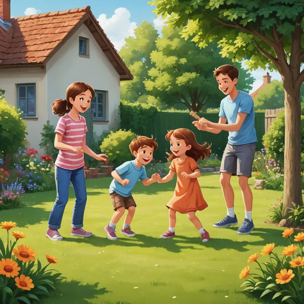 اطفال يلعبون شكل كرتون في حديقة ٣ اولاد و بنت و اب و ام