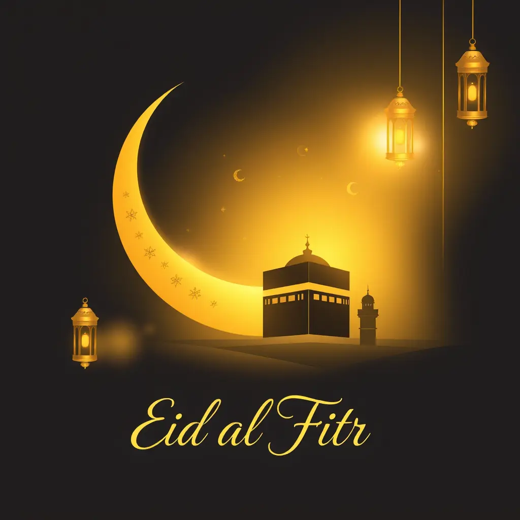 تصميم بمناسبة عيد الفطر يحتوي على ألوان راقية مثل الذهبي ، هلال مضيء مع زخارف إسلامية ناعمة ولمسات من الفوانيس الذهبية صورة كعبة صغيرة أو مسجد في الخلفية لإضافة الروحانية. تأثيرات ضوء ناعمة حول الهلال لجذب الانتباه.