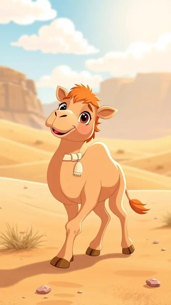 المطالبة: جمل كرتوني لطيف يسير في صحراء مشمسة، يبتسم ، الألوان دافئة ومناسبة للأطفال.