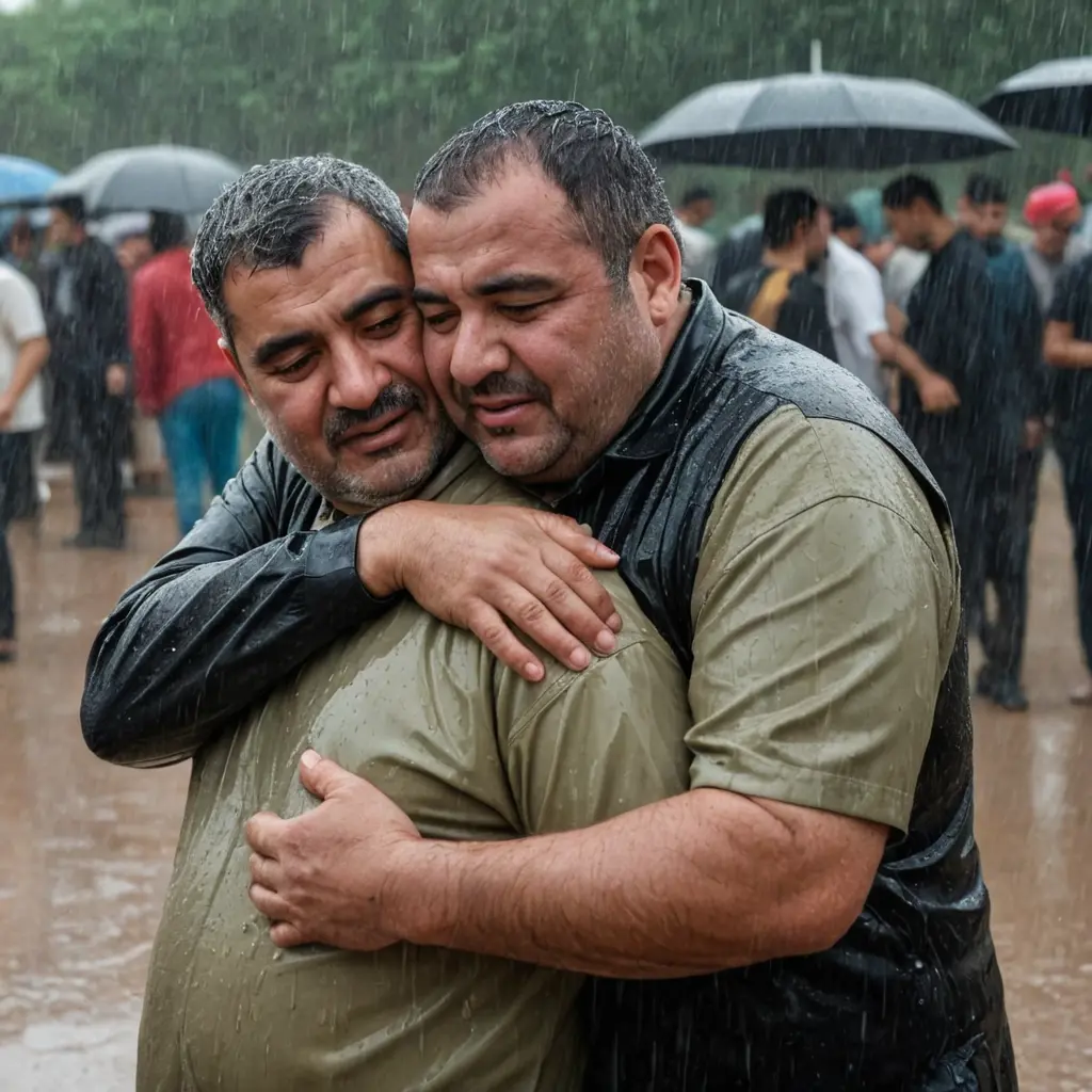 رجل عراقي خمسيني سمين مع رجل يحضنان بعض تحت المطر