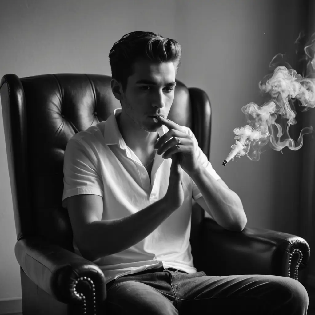 صورة شاب يدخن السجائر بلون ابض واسود وهوا جالس على كرسي وبتفاصيل دقيقة ودقة عالية