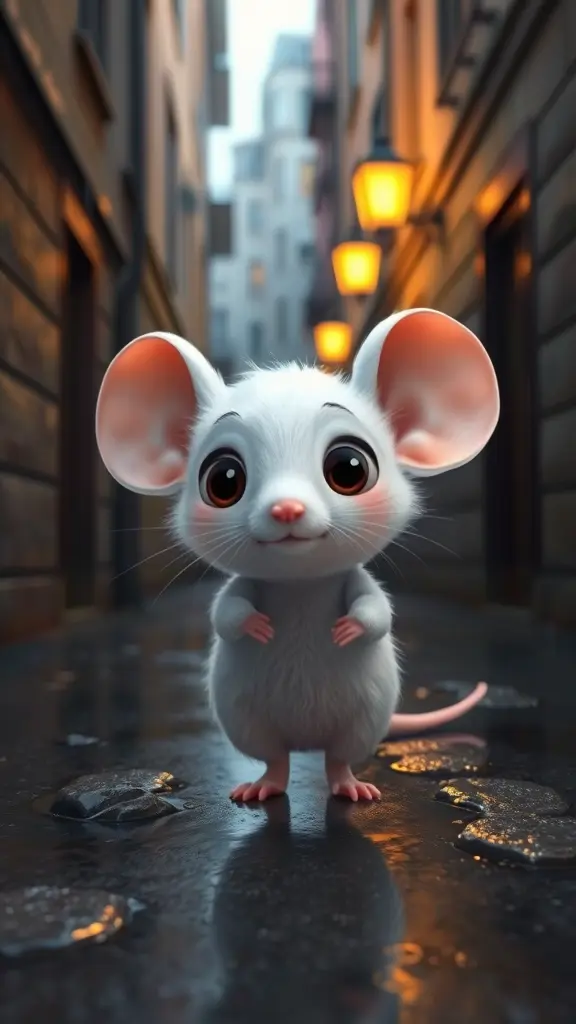 A cute white pet mouse with soft fur, big round black eyes, small pink paws, and a tiny pink nose, walking alone through a narrow, rainy alleyway. The alley is wet with puddles, dimly lit with yellow street lamps reflecting on the ground, and buildings on both sides. The mouse looks curious but calm. Pixar 3D style.
