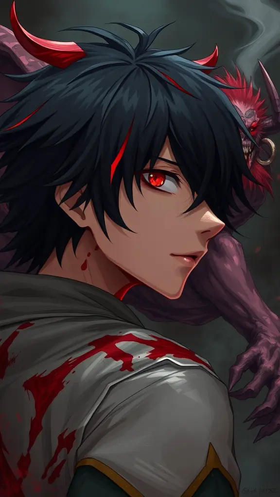صوره تعبر عن اكشن ودمويه وفانتزيا ويكون فيها شخص شعرو كثيف اسود وفيه خصل حمراء وعيانان حمراوان وكمان يخرج من ظهره شيطان شعره احمر عيانه حمراوان وينظران الي الشاشه من الجانب
