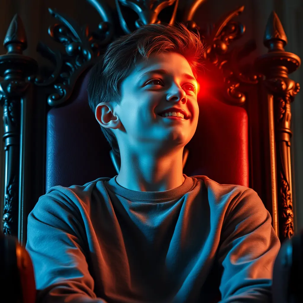 ولد عمره 17 لديه يجلس على عرش ف تصوره من الاسفل ويخرج من عينه اليمناء ضوا احمر ومن عينه اليسراضوا ازرق يبتسم وينضر الى الجه اليمنا