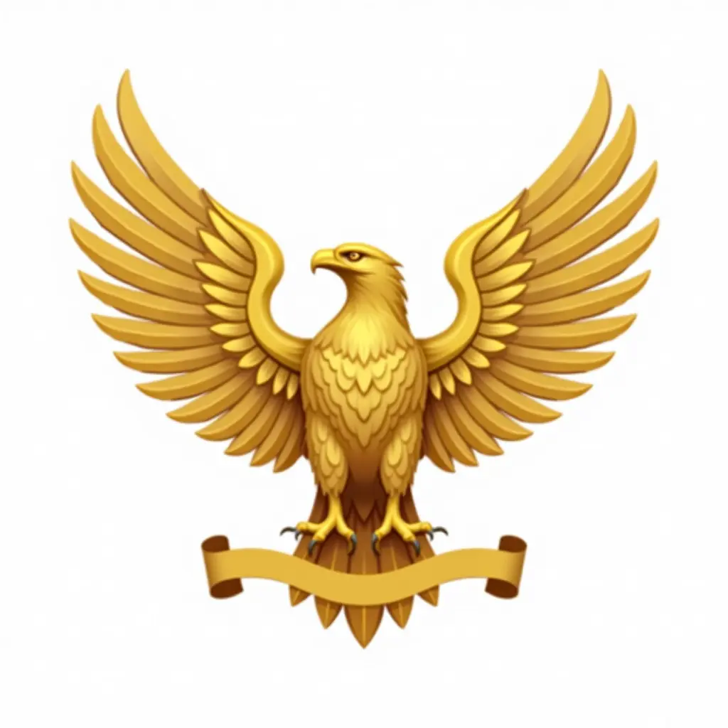 Design an emblem of a golden eagle with its wings fully spread, soaring upwards and facing the sky. The eagle should have detailed golden feathers, giving it a majestic look. The background should be pure white, providing contrast with the eagle. Behind the eagle’s head, add a ribbon (not below its legs), designed for the inscription of the two shahadas in the future. The entire design should be in flat colors, with no shading or shadows, for a clean and bold look suitable for flags and banners.”