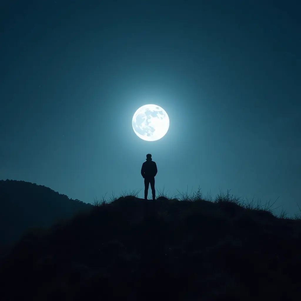 صورة رجل يقف أمام ضوء أشعة القمر في تل