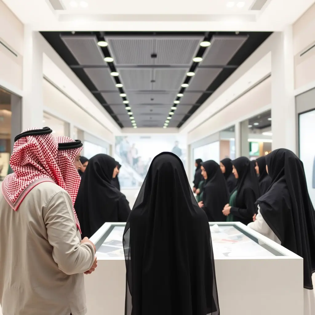 نساء سعوديات و رجال سعوديون.  تسوق. رجال و نساء .شباب و شابات يتجمعون حول كلمة عروض ثلاثية الابعاد  في صالة تسوق ، خلفية بيضاء. نساء ترتدي العباية بلون اسوداء،  مشهد كامل.