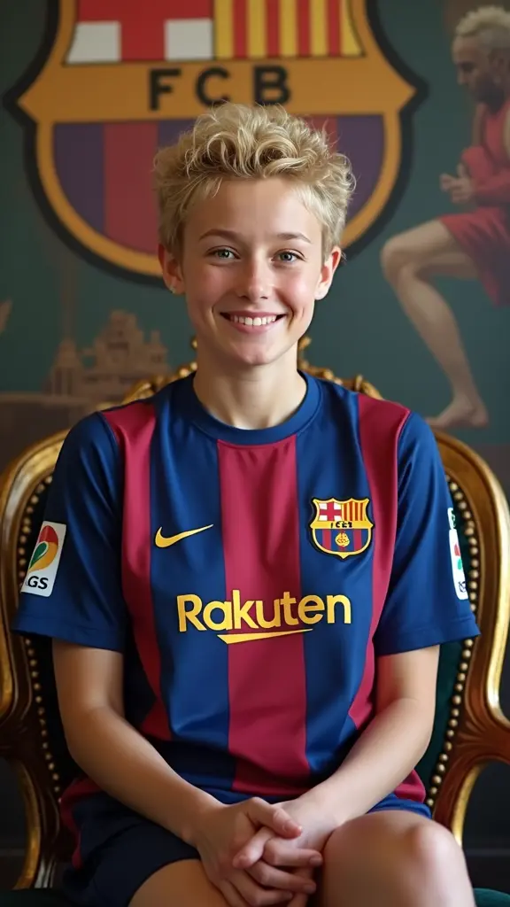 شابة ، فاتنة، جميلة، شقراء، عيون واسعة، شعر قصير كيرلي، ترتدي قميص نادي برشلونة، تجلس على كرسي فخم مرصع بالذهب، خلفها جدارية كبيرة فخمة، عليها عار برشلونة