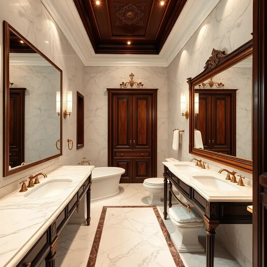 Luxurious old money style bathroom featuring two elegant sinks with a large mirror and custom wooden cabinet. The bathroom includes a classic banio (bathtub) and toilet. The design combines rich Calacatta marble on countertops and floors with bronze fixtures and detailing throughout. Accents of dark polished wood add warmth and timeless sophistication. The atmosphere is refined, calm, and aristocratic, with soft lighting and traditional elements.”