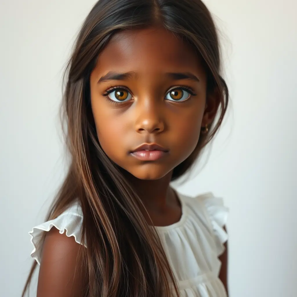 صورة بنت شعرها بني طويل عيونها عسلية طويلة ترتدي فستان ابيض لون بشرتها خمرية