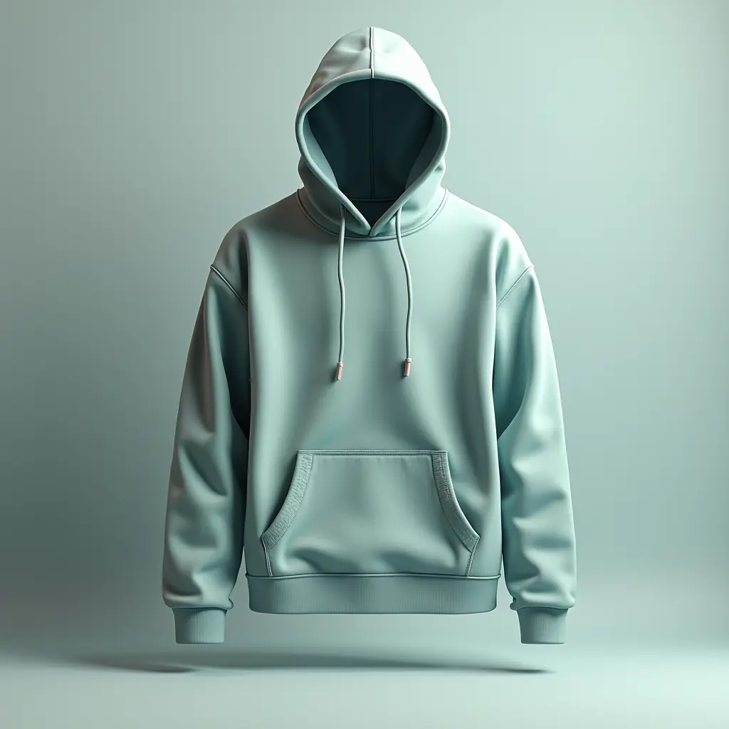 Create a high-end commercial poster featuring a hoodie product placed at the center, floating slightly above the ground with realistic shadows. The hoodie should be fully visible, front-facing, and crisply lit to highlight its texture and folds. Use a clean gradient or smooth background that matches or complements the color palette of the hoodie (auto-adjust background color based on the hoodie's dominant color). Add soft fog or subtle light flares around parts of the hoodie to add depth and contrast. Include faint shadowed or blurred duplicates of the word "HOODIE" in the background, but do not include any actual text or branding. The entire design should feel premium, minimal, and focused on the product itself. Use soft lighting and modern poster aesthetics. Render in 4:5 aspect ratio, ultra-HD quality