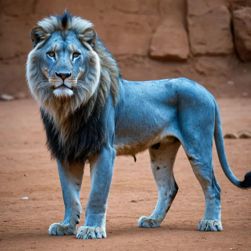 أسد أزرق يظهر جسمه بالكامل ينظر نظرات حادة ومكتوب على جبينه اسم محمد جلال