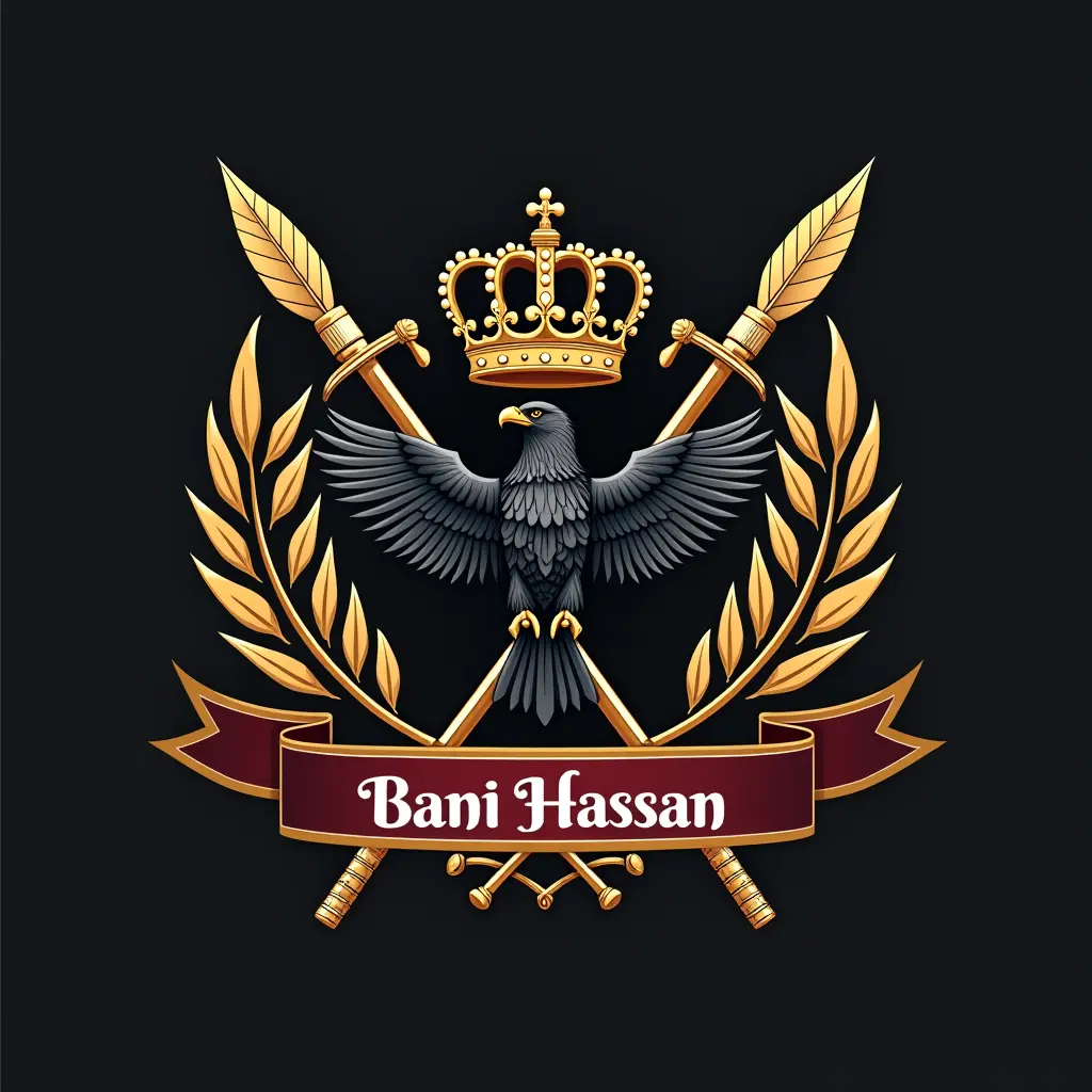 تصميم شعار لقبيلة بني حسن يكون يحتوي اشعار على رمز القبيلة 515 ويحتوي علة اسلحة عربية مثل اسيف اسهم ورمح ويكون يحتوي على تاج ويحتوي على طير العقاب ويكون الوان السلحة من الذهب ولون العقاب اسود ويكون لون التاج من الذهب يكون الشهار على لون خمري ودي الكتابة تكون واضحة بشكل واضح مكتوب بني حسن