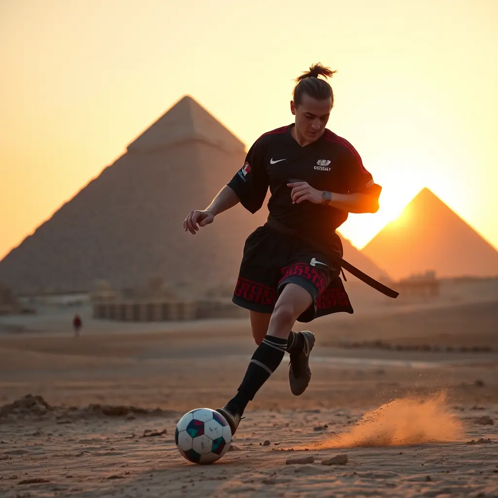 لاعب كرة القدم هالاند يراوغ الكرة أمام اهرامات مصر، بوقت الغروب والجو يبدو برتقاليا، يرتدي زي ساموراي ياباني