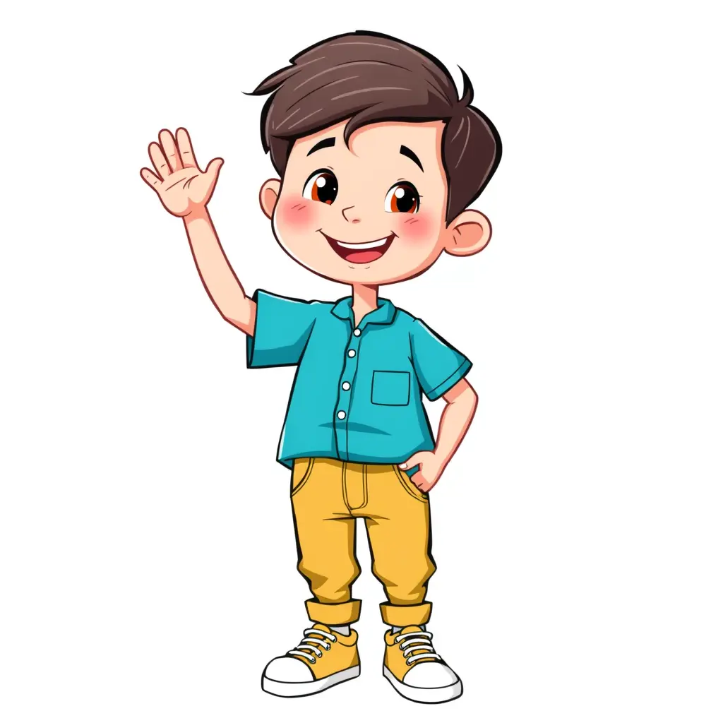 ولد صغير كرتوني بتصميم مرح، يبلغ من العمر حوالي 7-9 سنوات، بملامح ودودة وابتسامة مشرقة. يرتدي قميصًا مريحًا بألوان زاهية (مثل الأزرق والأخضر أو الأصفر)، وسروالًا مريحًا مناسبًا للحركة، وحذاء رياضي بسيط. شعره قصير ومصفف بعناية، ويبدو مفعمًا بالحيوية. يقف بوضعية نشيطة، إما وهو يرفع يده للإجابة أو يمسك بلوحة تعليمية فارغة . تعبيره يظهر الحماس والتركيز، والخلفية شفافة لتسهيل الاستخدام في المشاهد المختلفة."