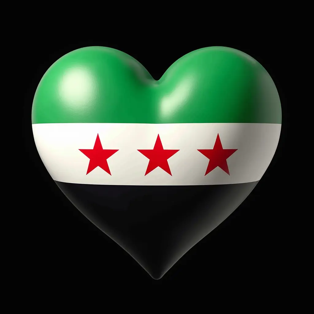 صورة قلب موضوع عليه العلم السوري الذي يتكون من اللون الأخضر في الجزء العلوي والأسود في الجزء السفلي وثلاث نجوم حمراء في المنتصف على خلفية سوداء