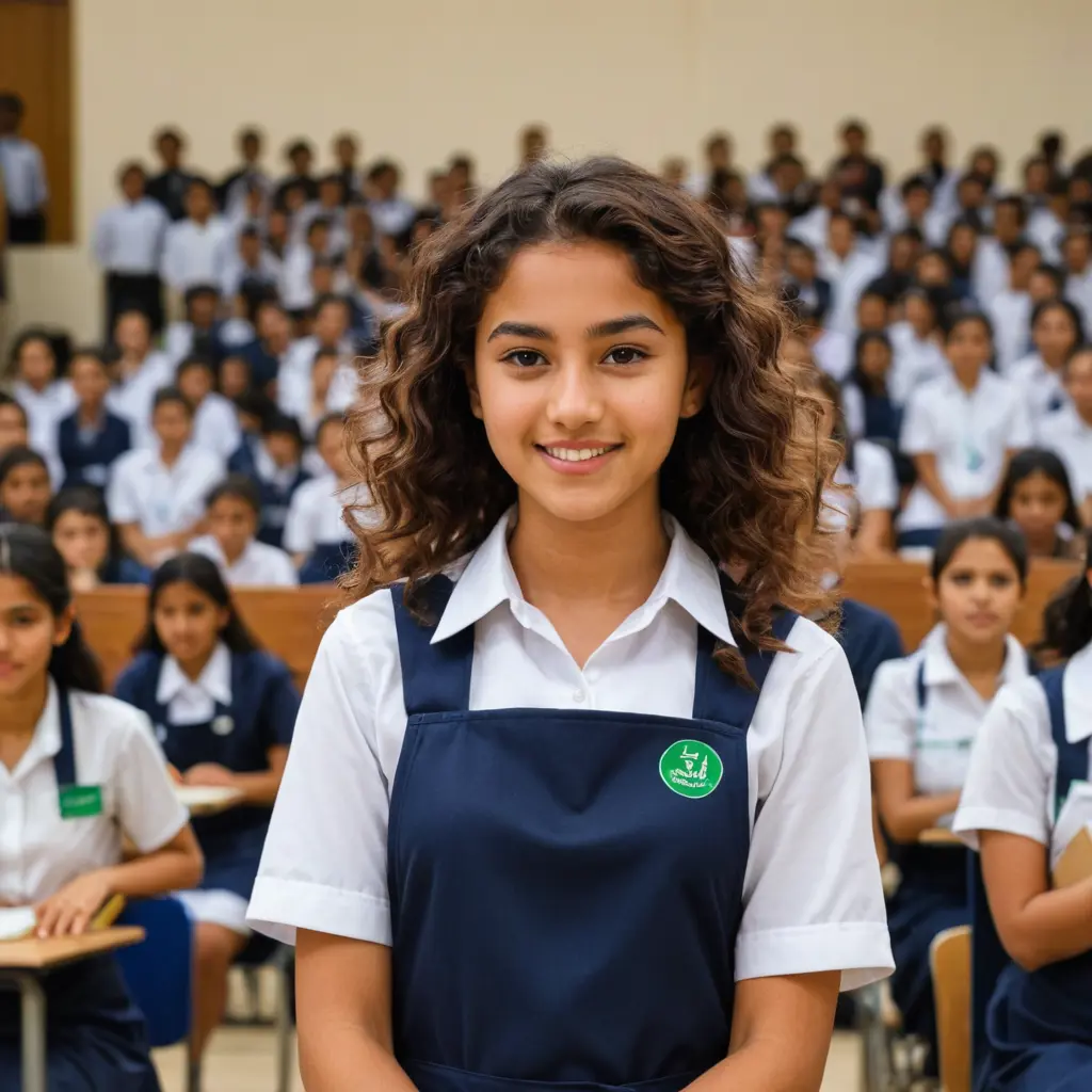 صورة طالبة مدرسة الثانوية مرتبة الشعر شعرها كيرلي طويل بني مسوّد مائل للاحمر تلبس مريول مدرسي كحلي وقميص أبيض ( الزي المدرسي السعودي للمرحلة الثانوية ) صامته بابتسامة خفيفه ومتفاءلة وتزعزع نظراتها للجميع بملامح سعودية وتقف لوحدها أمام الجمهور ولا يوجد اي شخص خلفها