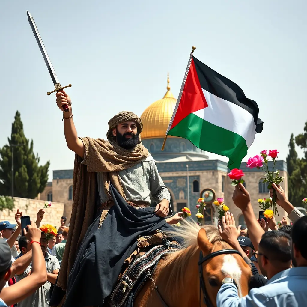 صوره لشاب ملسم يحمل بيد سيف وبرجل اخرى علم فلسطين ويجري على الحصان باتجاه المسجد الاقصى ويستقبله الناس بالورد في يرفعونه في السماء