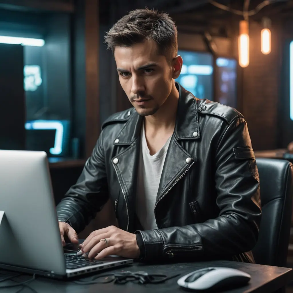 hombre castaño de pelo muy corto, piel blanca y mediana edad, bajito, con chaqueta de cuero, trabajando con pc, cyberpunk, cyberpunk
