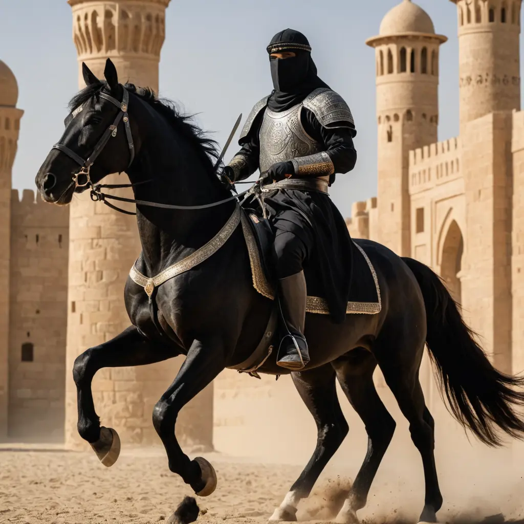 فارس عربي ملثم يحمل سيف ويمتطي حصان أسود