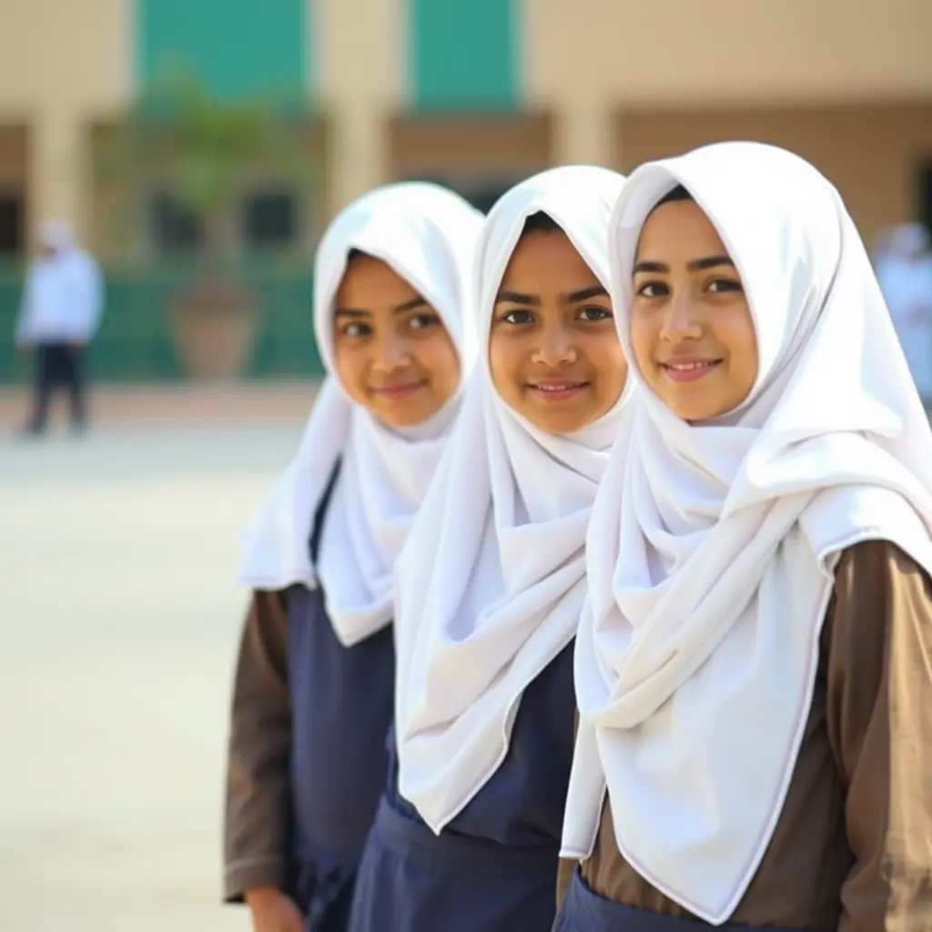 صور بنات عُمانيات بزي مدرسي حجاب ابيض ومريول كحلي في فناء المدرسة