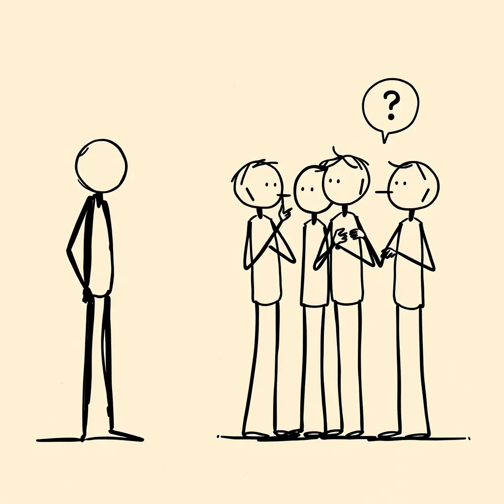 A stick figure stands alone on the left. A group of 3–4 stick figures on the right whisper and point. One has a small speech bubble with a question mark inside, in black hand-drawn stick figure style, on a beige textured paper background, minimal sketch, clean black lines, no color, vintage illustrated look, centered composition, high contrast.