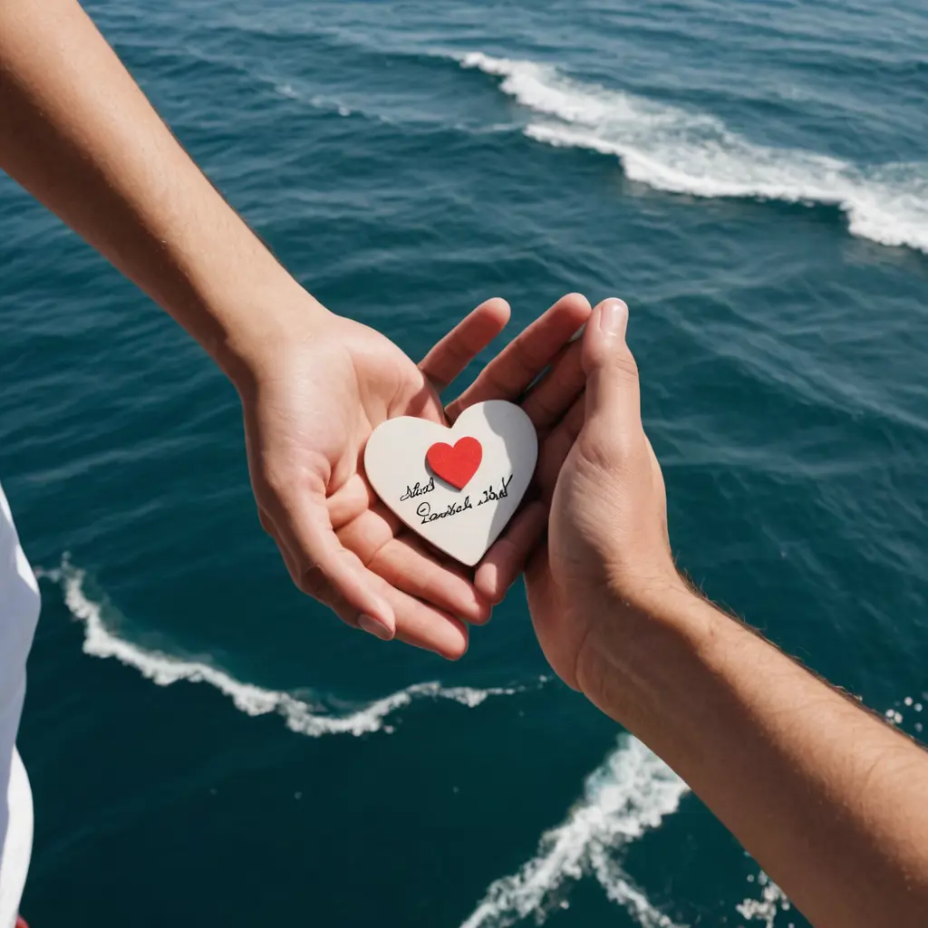 صوره لشخص يمسك يد حبيبته على البحر مع وجود قلب كتب في داخله عادل وشهد