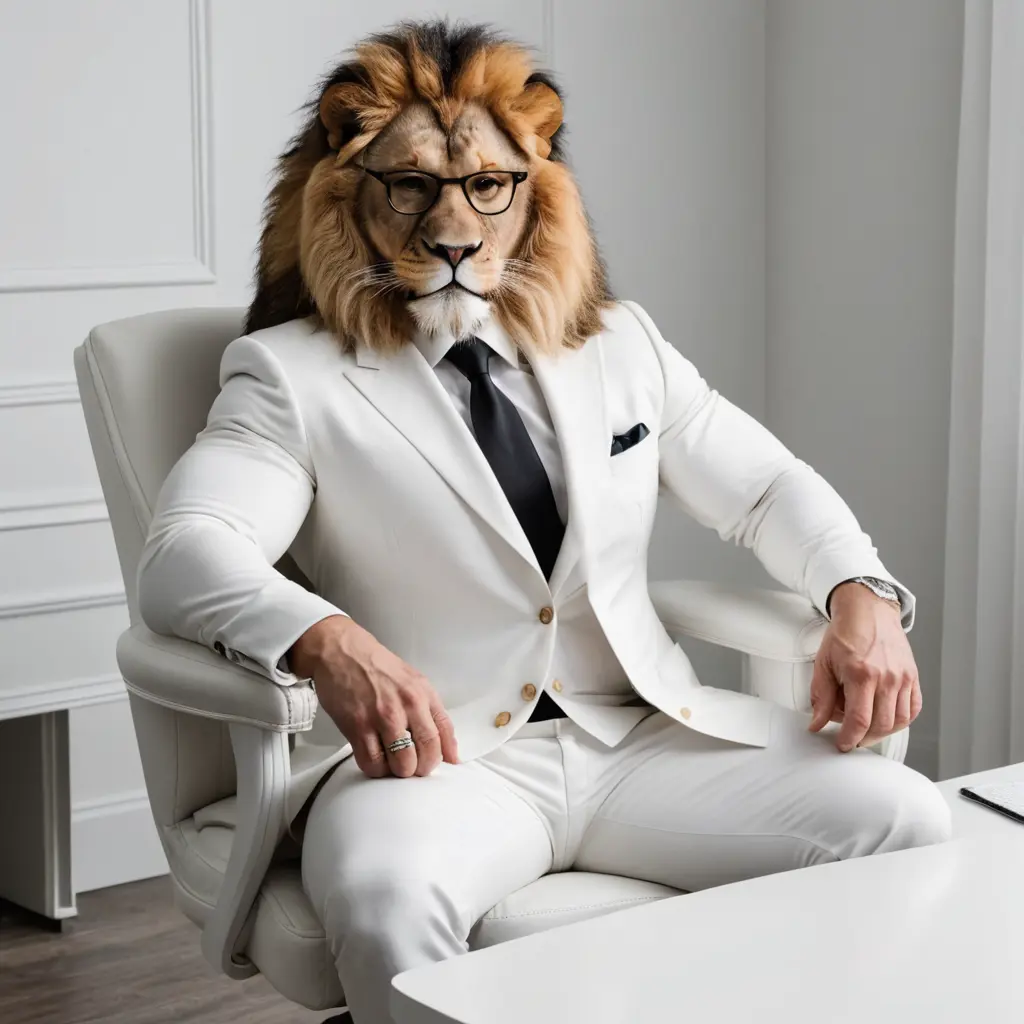 صورة اسد جالس على مكتب كله ابيض ويلبس لابس رسمي لون ابيض مع عضلات باليد ولابس نظارات يجلس بجنب له عضلات ضخمه يجلس على كرسي ابيض ضخم