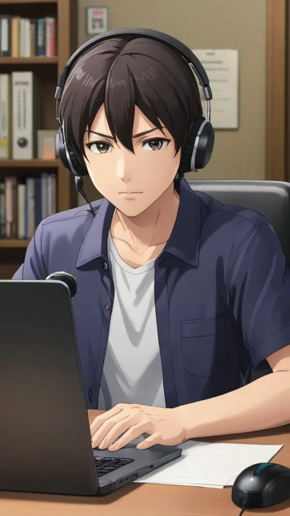 شخصية انمي رجل تجلس علي مكتب وأمامه لابتوب وميكروفون والصورة من بعيد قليلا