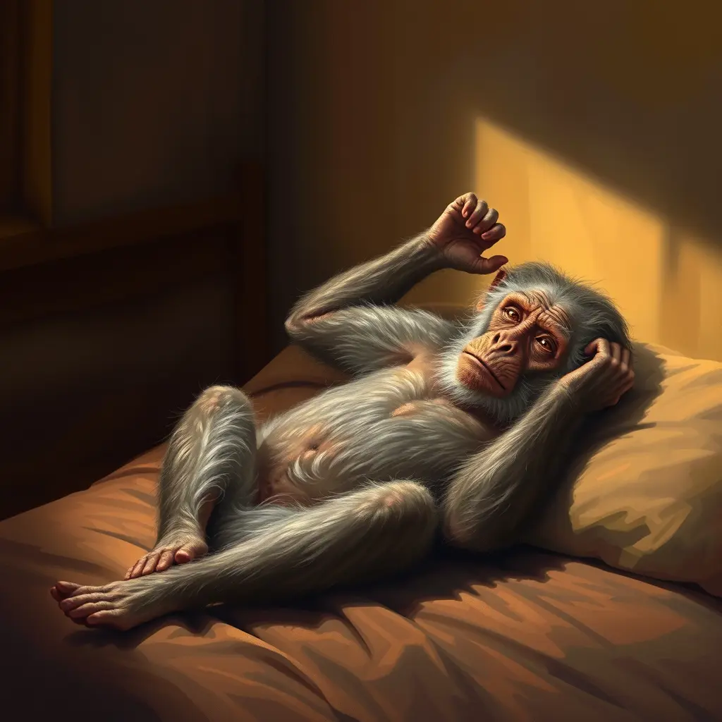 قردٌ كبير بالسن مستلقٍ على ظهره في غرفة نوم دافئة ذات إضاءة دافئة، ساقاه متقاطعتان ويداه مستريحتان برفق خلف رأسه. يبدو عليه الحزن والقلق، غارقًا في أفكاره وهو يحك رأسه برفق، فتتساقط خصلات شعره الخفيفة على عينيه. الإضاءة دافئة ومنتشرة، تلقي بظلالها اللطيفة على الجدران، مما يضفي على المشهد جوًا حميميًا وتأمليًا. رُسمت اللوحة بأسلوب الرسم الرقمي بألوان غنية نابضة بالحياة وتفاصيل دقيقة.