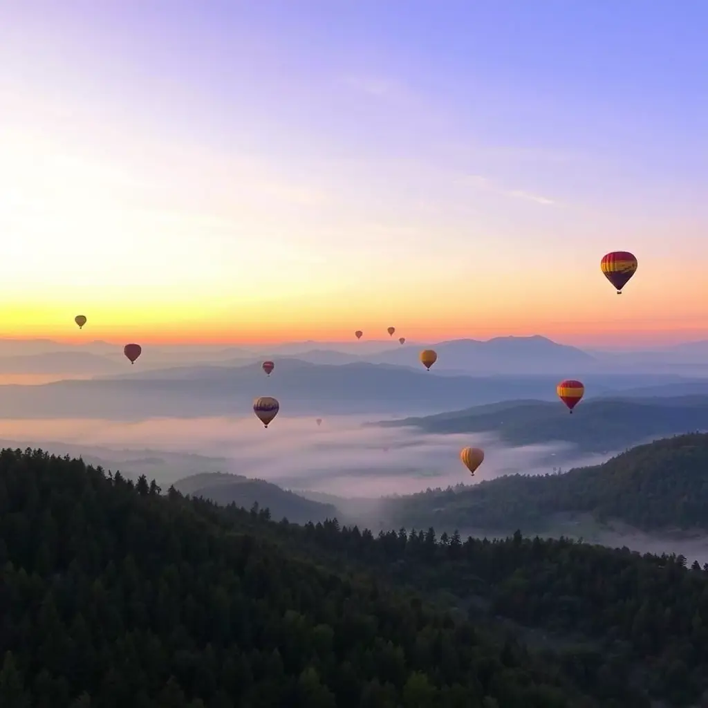 "منظر طبيعي خلاب عند شروق الشمس تظهر فيه مجموعة من المناطيد الملونة تحلق في السماء فوق غابة كثيفة وتلال مغطاة بالضباب، تتدرج ألوان السماء بين الأصفر والبرتقالي والبنفسجي، مما يخلق مشهداً ساحراً وهادئاً يعكس روح المغامرة والجمال الطبيعي."