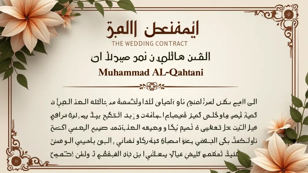بطاقة دعوة زواج مكتوب عليها عقد قران كوثر الحشونو و محمد القحطاني فقط لا شيء اخر ومكتوبة باللغة العربية