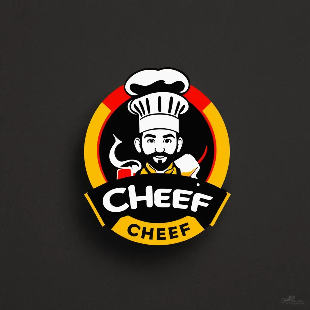 شعار مطعم وجبات سريعة بأسم مطعم الشيف باللغة العربية يحتوي على اللون الاسود و الاصفر و الاحمر