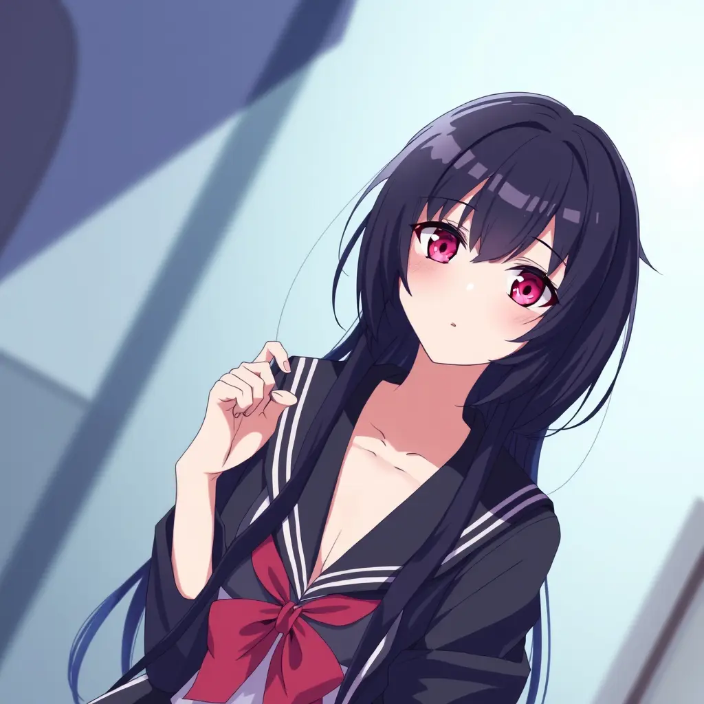 بنت انمي شعرها اسود عينها وردي جميلة باردة و تلبس ملابس مدرسية