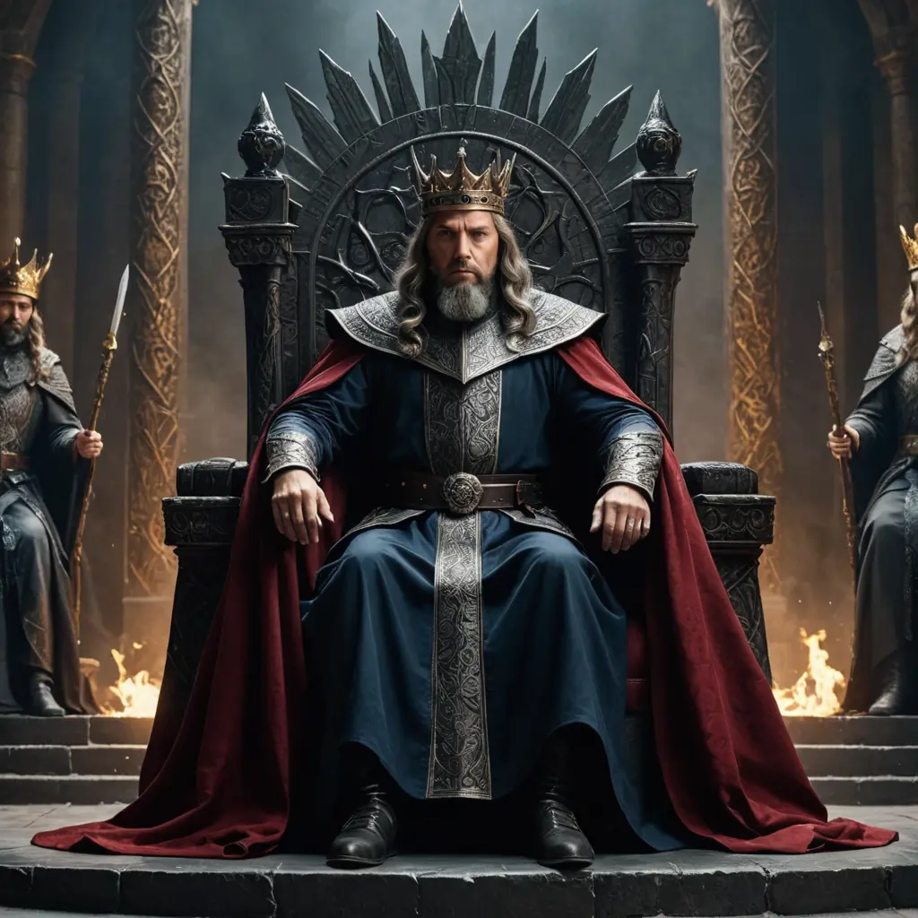 صورة ملك على عرش بوش شرير (نظرة متجبرة). سحرة بملابس غامضة في خلفية العرش.