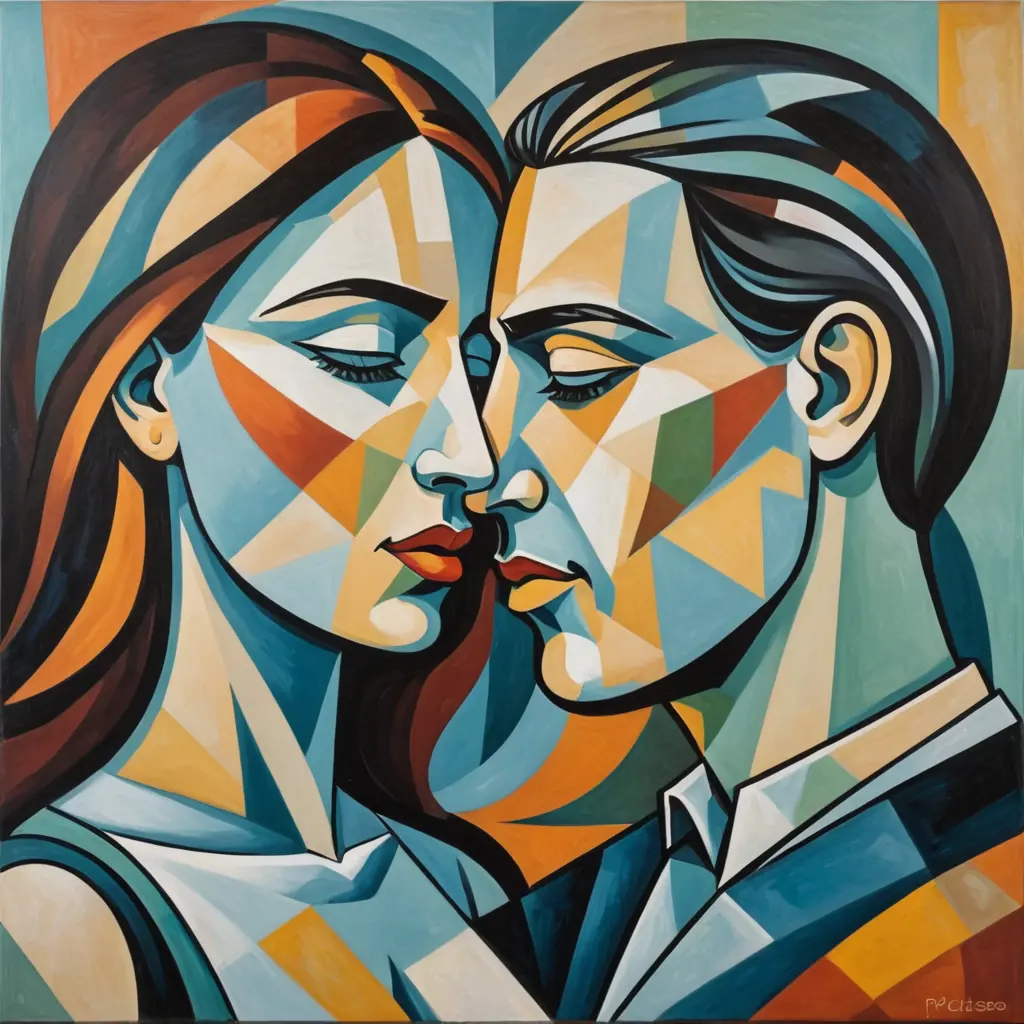 Abstract geometric painting depicting the faces of a man and a woman in love, sharing a tender moment, with a Picasso style