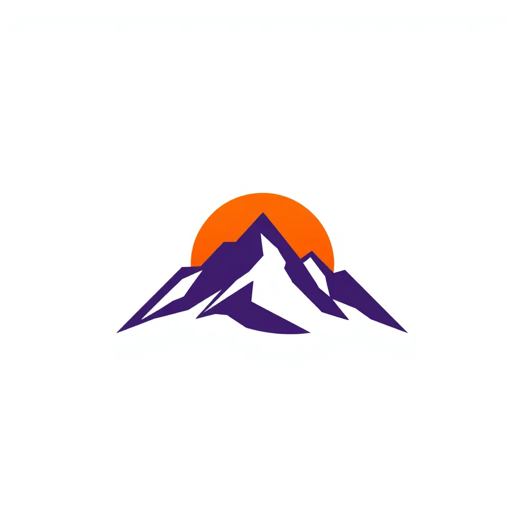 شعار جبل بسيط غير متناظر مع غروب شمس، بتدرجات البرتقالي والوردي والبنفسجي، بتصميم عصري وجودة عالية