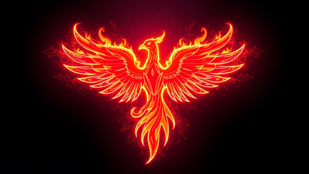 شعار طائر العنقاء يخرج من نيران رقمية، بمظهر مستقبلي وألوان نيون مضيئة، ثلاثي الأبعاد