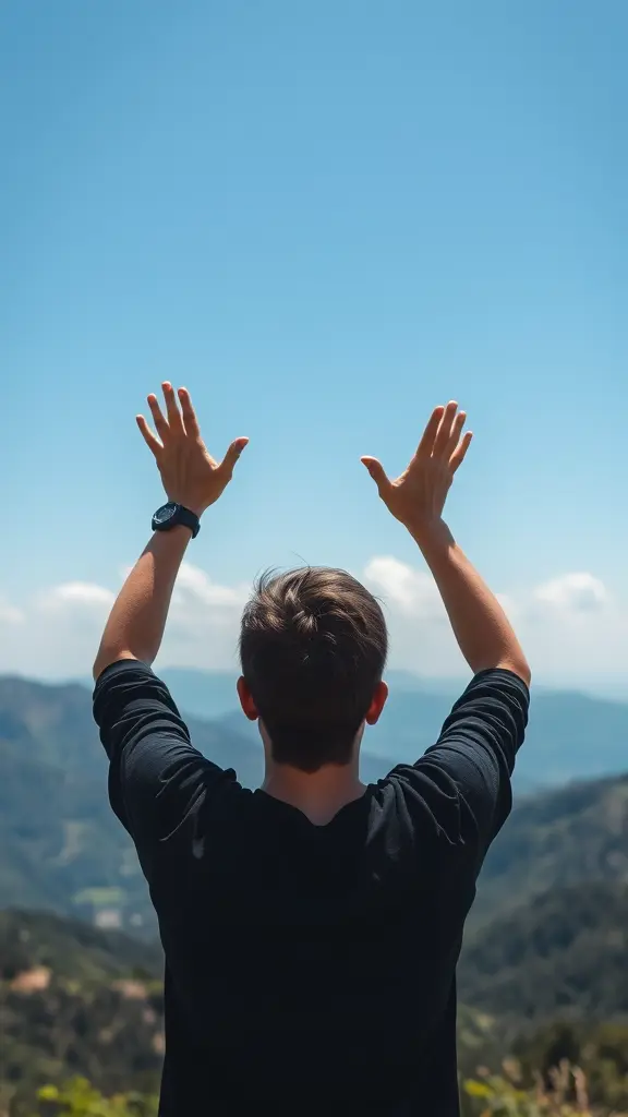 شخص يرفع يديه إلى السماء في لحظة شكر، مع منظر طبيعي جميل في الخلفية، يعكس الإيجابية والامتنان.
