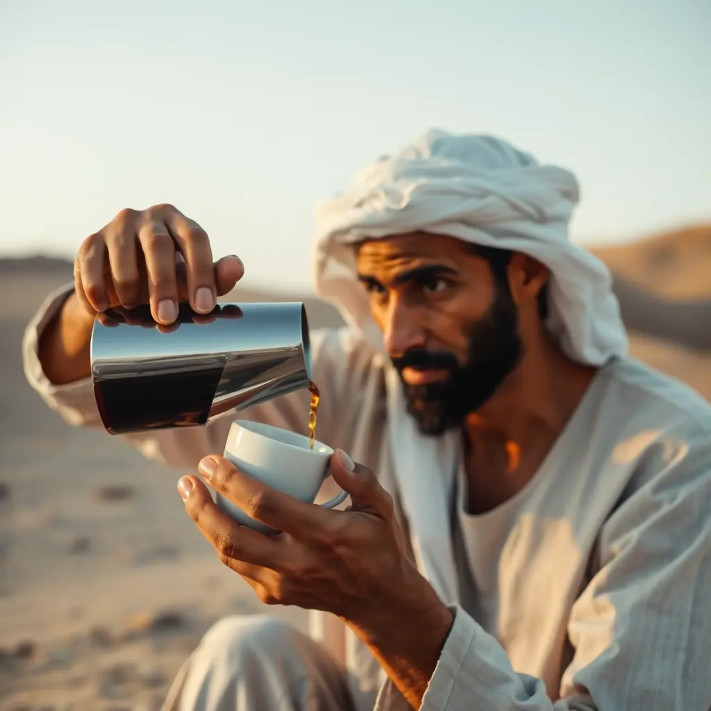 رجل بدوي يصب قهوة مرة ،فنجان ابيض