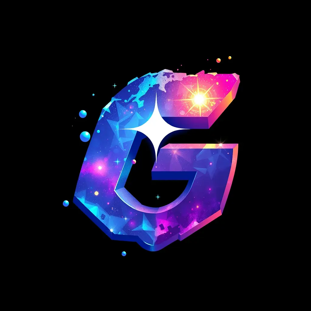 شعار جميل لشركة ألعاب، حرف G مع تأثيرات مجرة، بأسلوب فني حيوي يشبه ألعاب البكسل