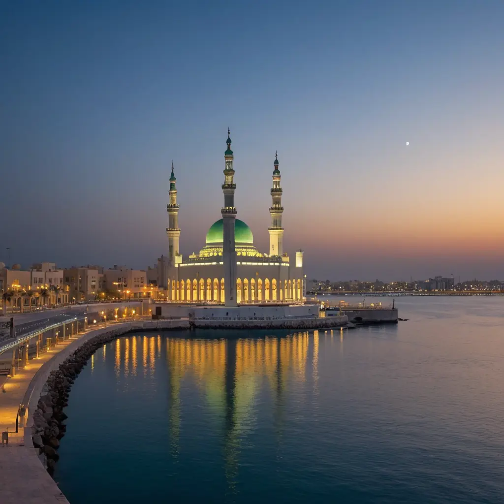 مسجد الرحمة العائم في مدينة جدة على ساحل البحر الأحمر، عمارة الفنون الإسلامية، معالم دينية مقدسة في وقت النهار, الفن الهندسي المعماري على الطراز الحديث والمتطور لبناء المساجد في المملكة العربية السعودية