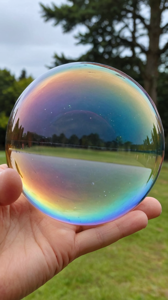 فقاعة صابون كاملة بألوان قوس قزح، مركزها شفاف