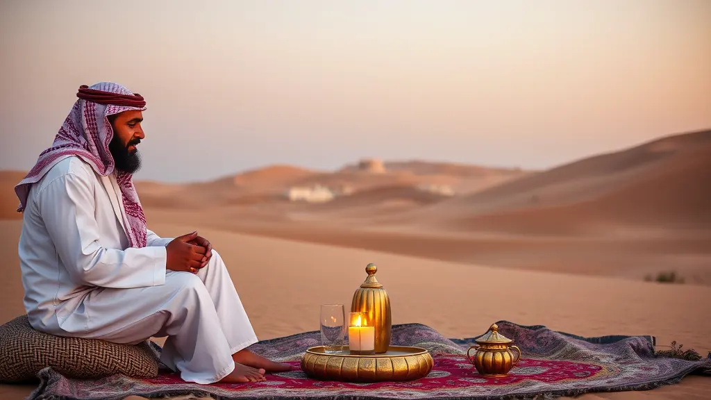 مجلس عربى في الصحراء ورجل وامرأة جالسين يشربون القهوة