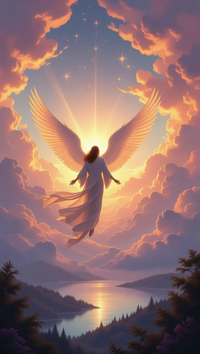 Gabriel's eternal journey spans thousands of years as he flies through an endless sky brimming with iridescent beauty and divine light. The sky is painted in hues of gold, pink, and purple, reflecting a celestial glow that bathes the clouds in shimmering radiance. Gabriel himself glides gracefully amidst swirling ethereal winds, his wings spanning wide and glistening with intricate golden patterns. The landscape below shifts from serene forests to tranquil seas, all bathed in the divine light that illuminates every detail with a heavenly radiance. Capture this scene in the style of a radiant digital painting, emphasizing the serenity and awe-inspiring beauty of Gabriel's timeless voyage through the cosmos.