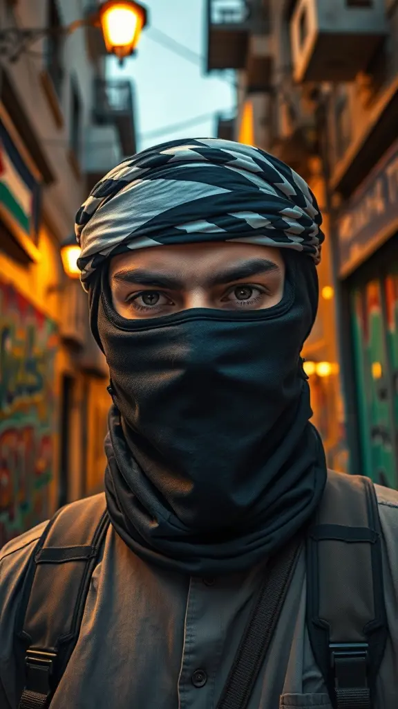 يقف رجل ملثم يرتدي كوفية فلسطينية، لا يظهر منه سوى عينيه، في زقاق عتيق تُضاءه مصابيح شوارع ناعمة ودافئة. الجدران المحيطة به مزينة بجداريات وكتابات غرافيتي نابضة بالحياة، تُضفي عليه سحرًا وتمردًا حضريين. الخلفية ضبابية للتركيز على شدة نظراته، على خلفية مشهد مدينة فلسطينية صاخبة عند الغسق. بأسلوب لوحة زيتية واقعية، تُجسد ثراء نسيج وألوان المكان.