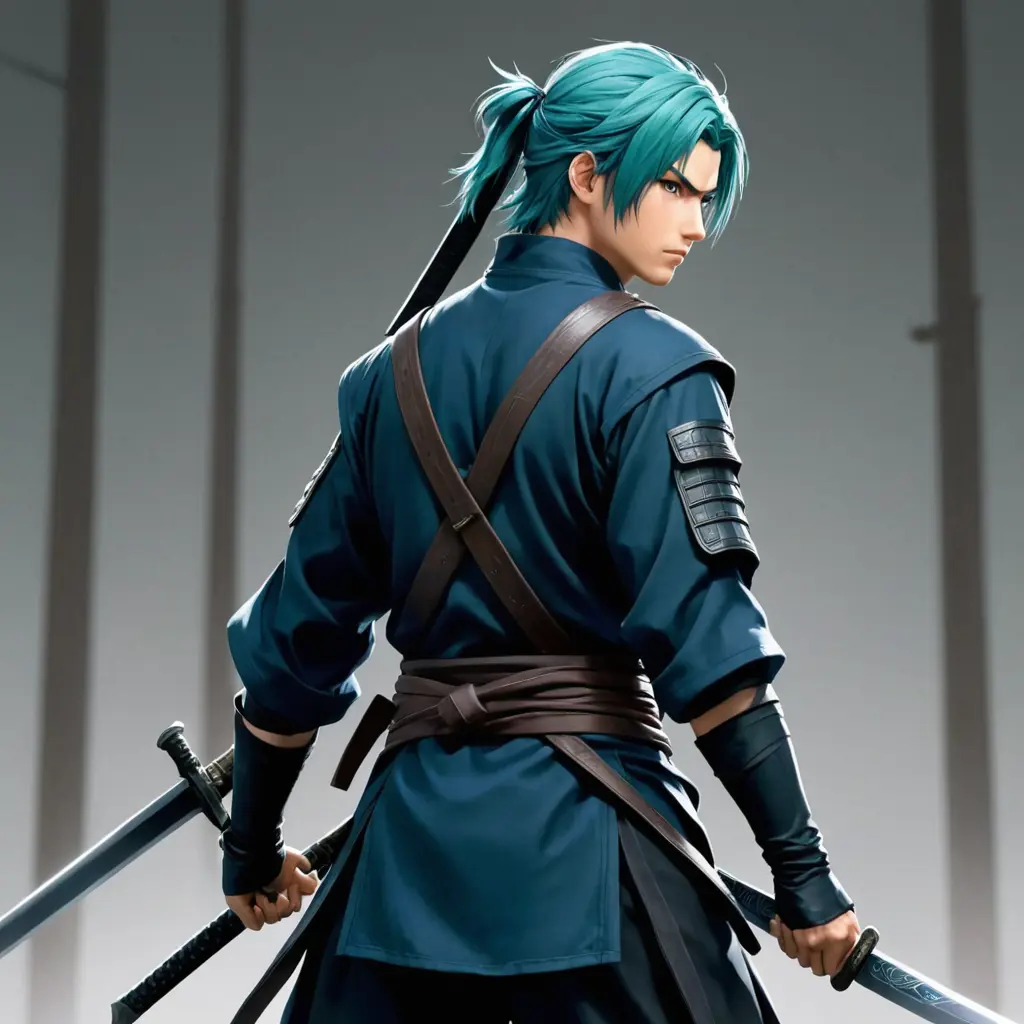اريد صورة لشخص يحمل سيف على ظهره كالنينجا على شكل انمي اريد ان يكون وجهه غاضبا و عينيه باللون الاخضر و شعره باللون الازرق