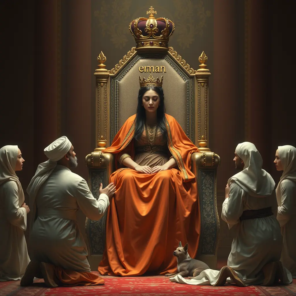 ملكة تجلس على عرش وعلى رأسها تاج مكتوب عليه eman  ويركع لعها الخدم بملابس الخدم خادم واحد رجل يركع امامها ومكتوب اعلى العرش اسمها eman