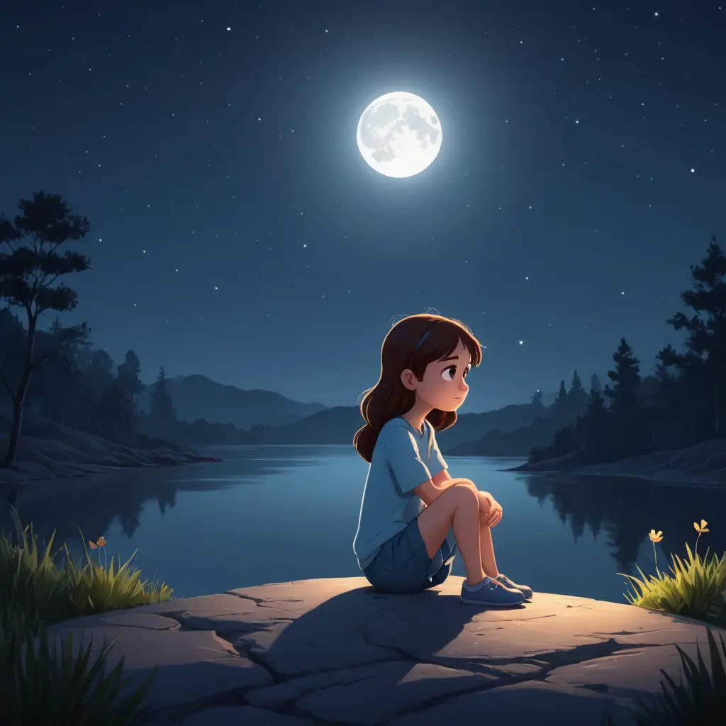 شخصية فتاة كرتونية حزينة تجلس على ضوء القمر