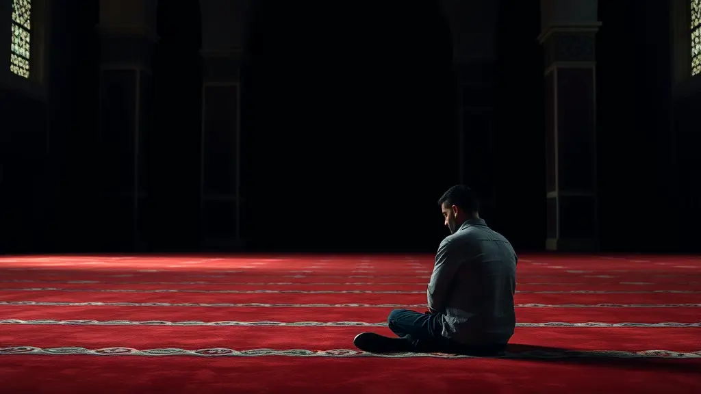 شخص بداخل مسجد يدعي وهو حزين وفيه خلفيه سوداء مع ارضيه سجاد المسجد بلونه الاحمر والشخص يجلس بالجنب مش في الوش